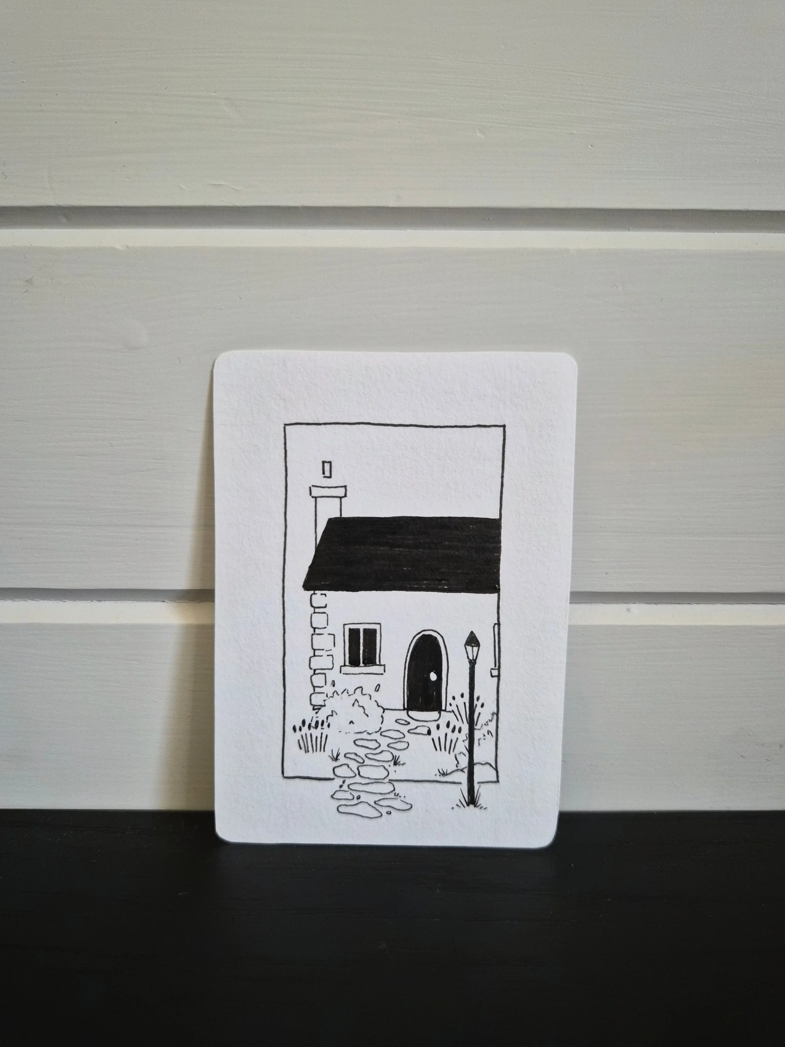Descriptor: a house with a leading stone footpath and light pole